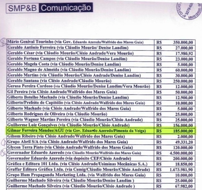 Lista inédita de beneficiários do caixa 2 da campanha à reeleição do então governador Eduardo Azeredo em 1998. O esquema foi operado pelo publicitário Marcos Valério de Souza, que assina a lista, registrada em cartório. O agora ministro do Supremo Tribunal Federal Gilmar Mendes aparece entre os beneficiários. Mendes teria recebido 185 mil reais.